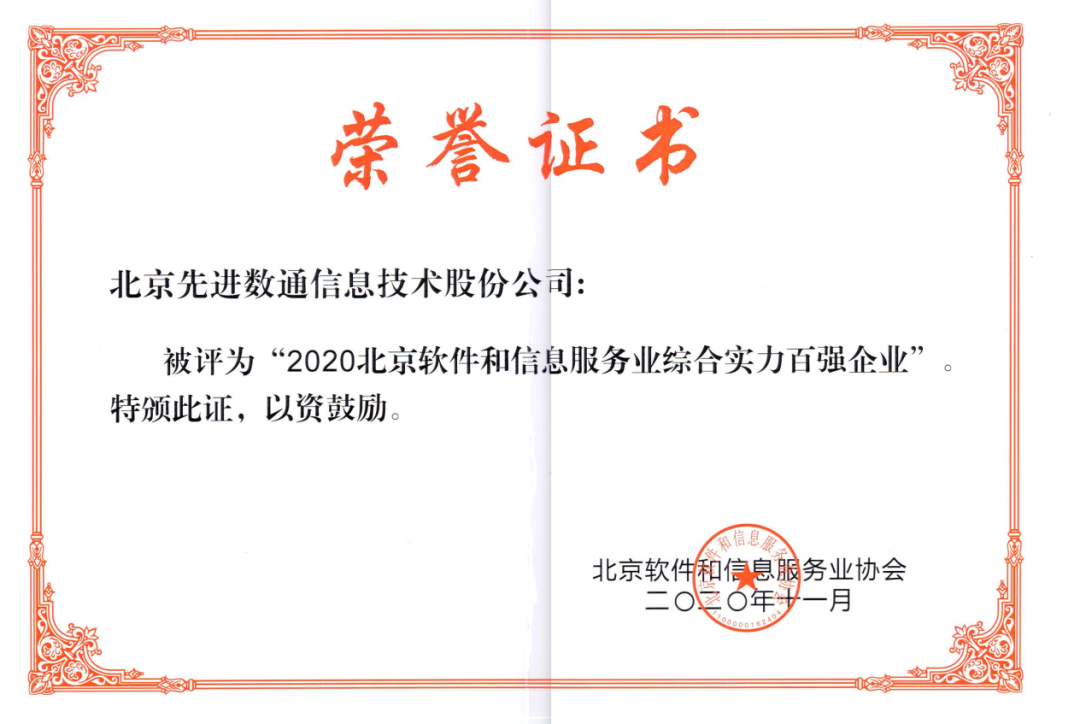 PA真人国际成功入选“2020北京软件和信息服务业信息综合实力百强”企业,并获评2020北京软件企业核心竞争力规模型企业。